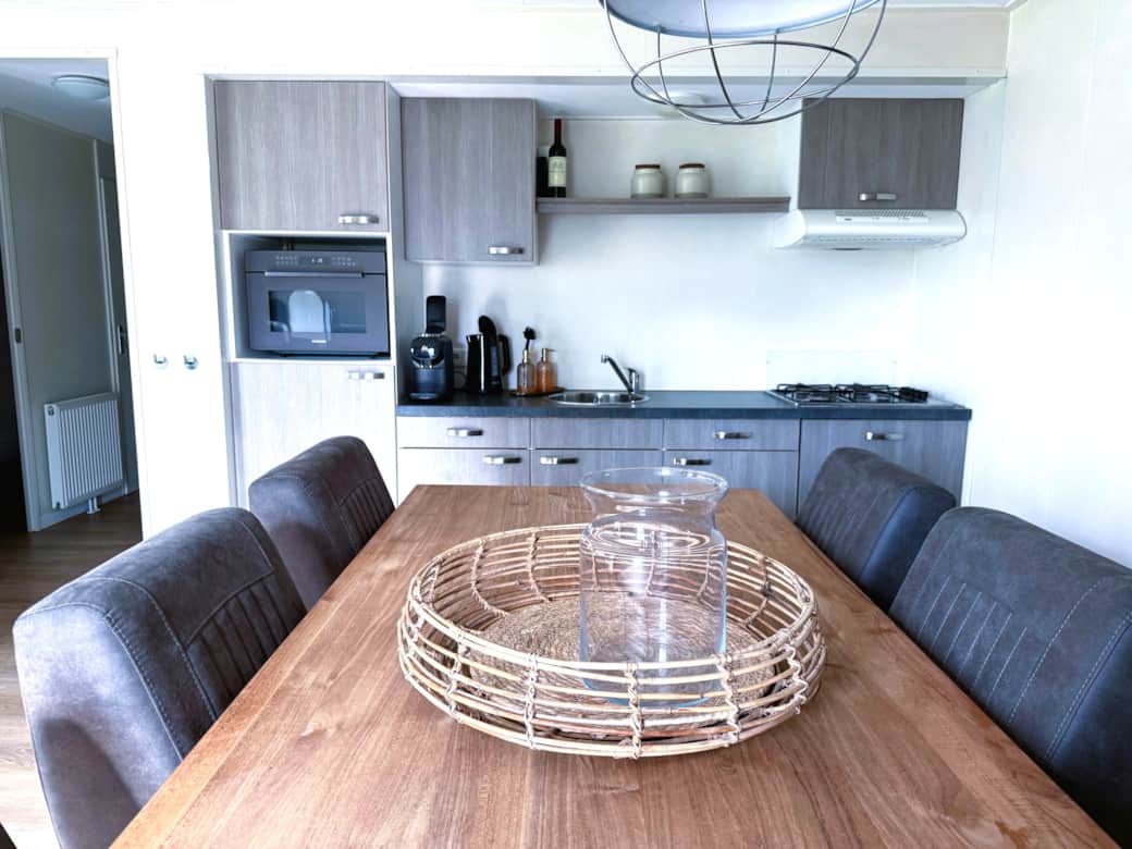 Binnen stap je in een warm en stijlvol ingericht chalet, met een eettafel voor zes personen in de open keuken.